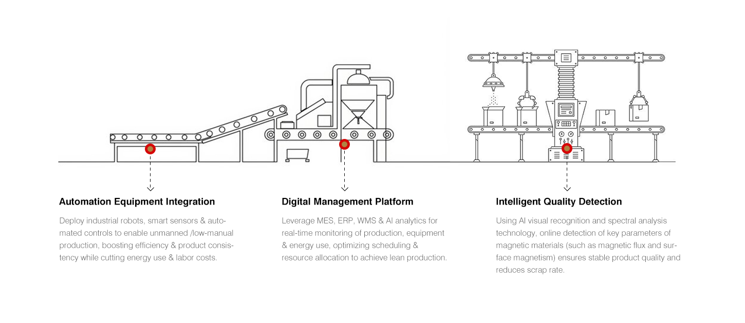 Jinlun Magnet grâce au système de fabrication intelligent certifié par des systèmes internationaux tels que IATF16949 et ISO9001/14001, combiné à des logiciels système tels que ERP, MES et WMS, nous avons obtenu une traçabilité complète de la qualité des processus, des matières premières aux produits finis. Tout en garantissant la qualité des produits, nous continuons à réduire les coûts de production grâce à l'innovation des processus, offrant ainsi à nos clients des solutions rentables supérieures aux normes de l'industrie.